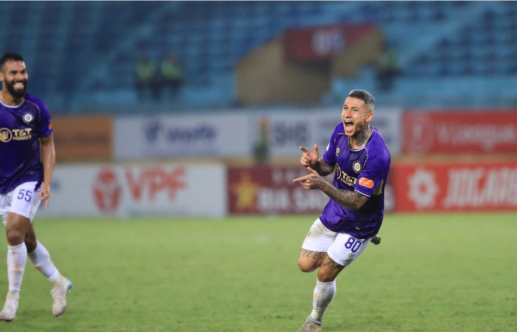 Fernando (phải) ăn mừng bàn thắng ở phút 58 giúp Hà Nội FC đánh bại Thánh Hóa 2-1. Ảnh: Hoàng Huynh