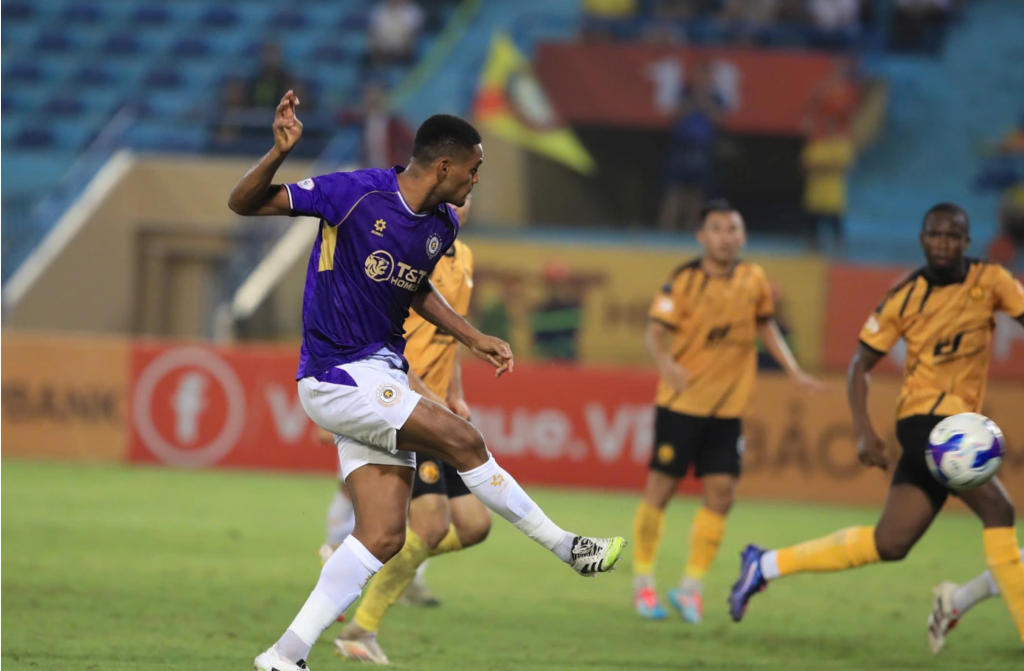 Tiền đạo Hà Nội FC Daniel Passira (áo tím) đệm cận thành ghi bàn gỡ hòa 1-1 ở phút 48. Ảnh: Hoàng Huynh
