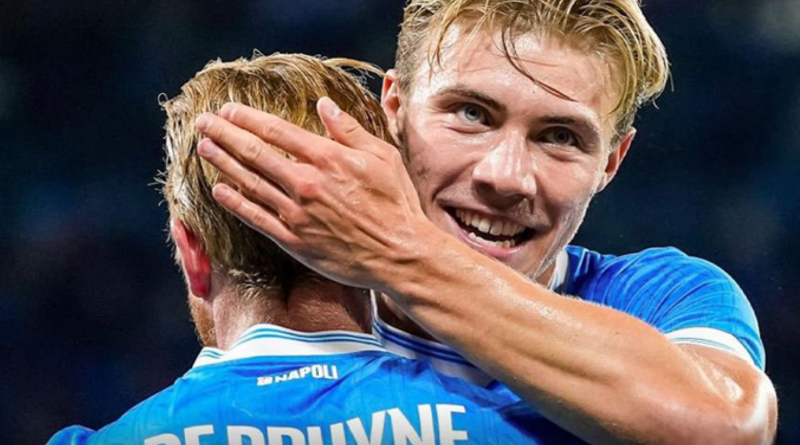 Với lợi thế sân nhà, Napoli sớm dồn ép Sporting Lisbon. Tới Phút 33, từ một pha phản công nhanh, tiền vệ Kevin de Bruyne chọc khe xé toang hàng thủ đối phương. Hojlund bứt tốc thoát xuống, khống chế gọn gàng rồi sút chân phải qua háng thủ môn Rui Silva, mở tỷ số cho Napoli. Sau bàn thắng này, tiền đạo Đan Mạch hôn lên biểu tượng Champions League.
